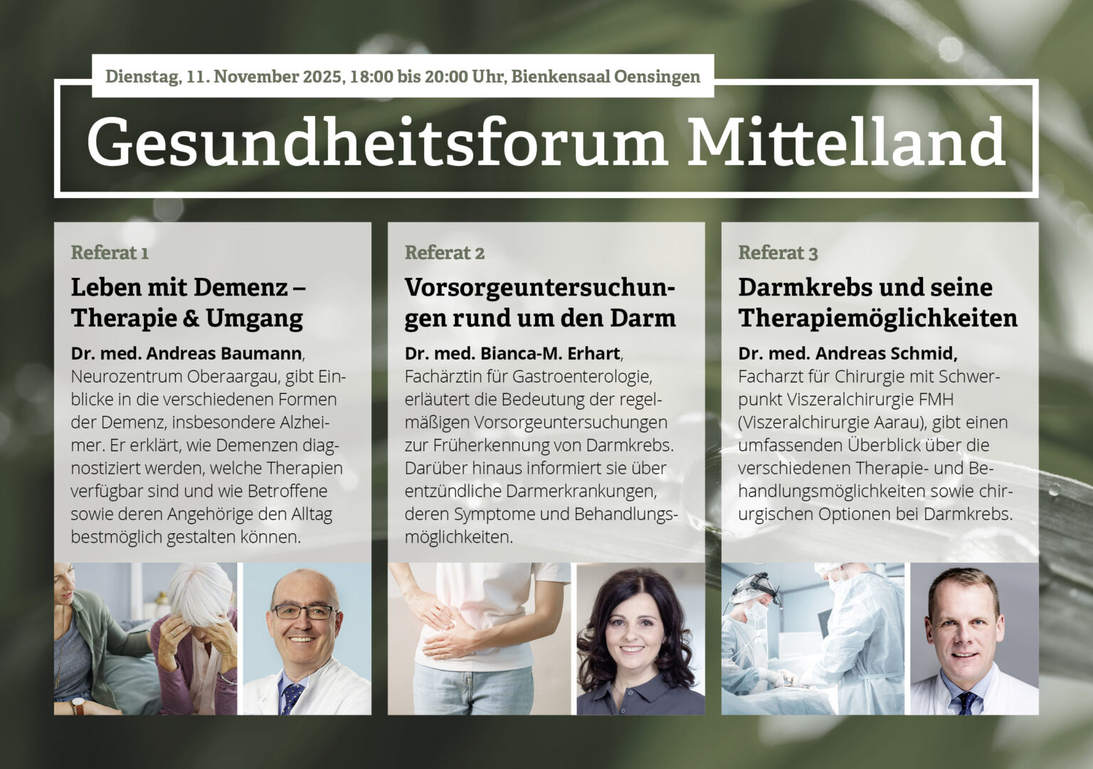 Am Dienstag, 11. November 2025, von 18:00 bis 20:00 Uhr findet das 4. Gesundheitsforum Mittelland im Bienkensaal Oensingen statt. Die Veranstaltung bietet Interessierten die Gelegenheit, sich aus erster Hand über aktuelle medizinische Themen zu informieren.