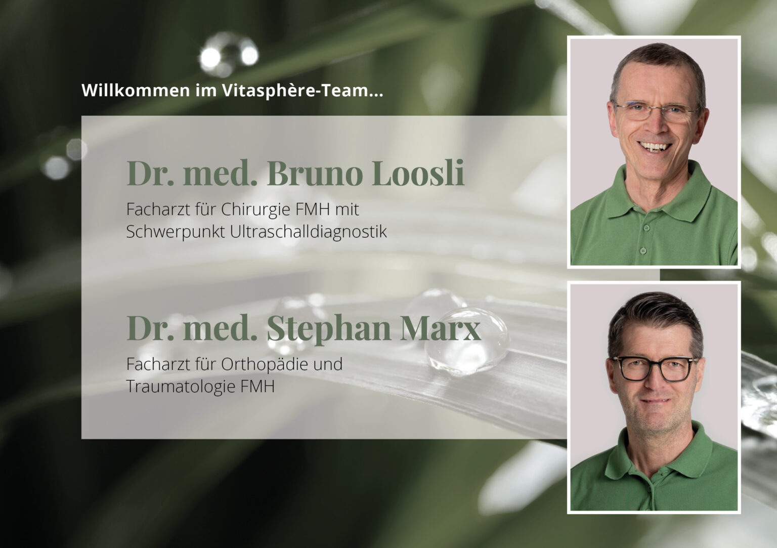 Wir heissen Dr. med. Bruno Loosli, Facharzt für Chirurgie FMH mit Schwerpunkt Ultraschalldiagnostik, sowie Dr. med. Stephan Marx, Facharzt für Orthopädie und Traumatologie FMH, herzlich in unserem Team willkommen.