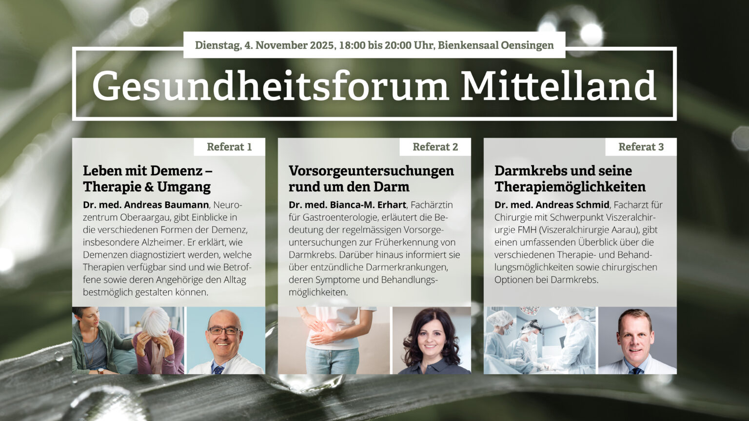 Am Dienstag, 4. November 2025, von 18:00 bis 20:00 Uhr findet das 4. Gesundheitsforum Mittelland im Bienkensaal Oensingen statt. Die Veranstaltung bietet Interessierten die Gelegenheit, sich aus erster Hand über aktuelle medizinische Themen zu informieren.